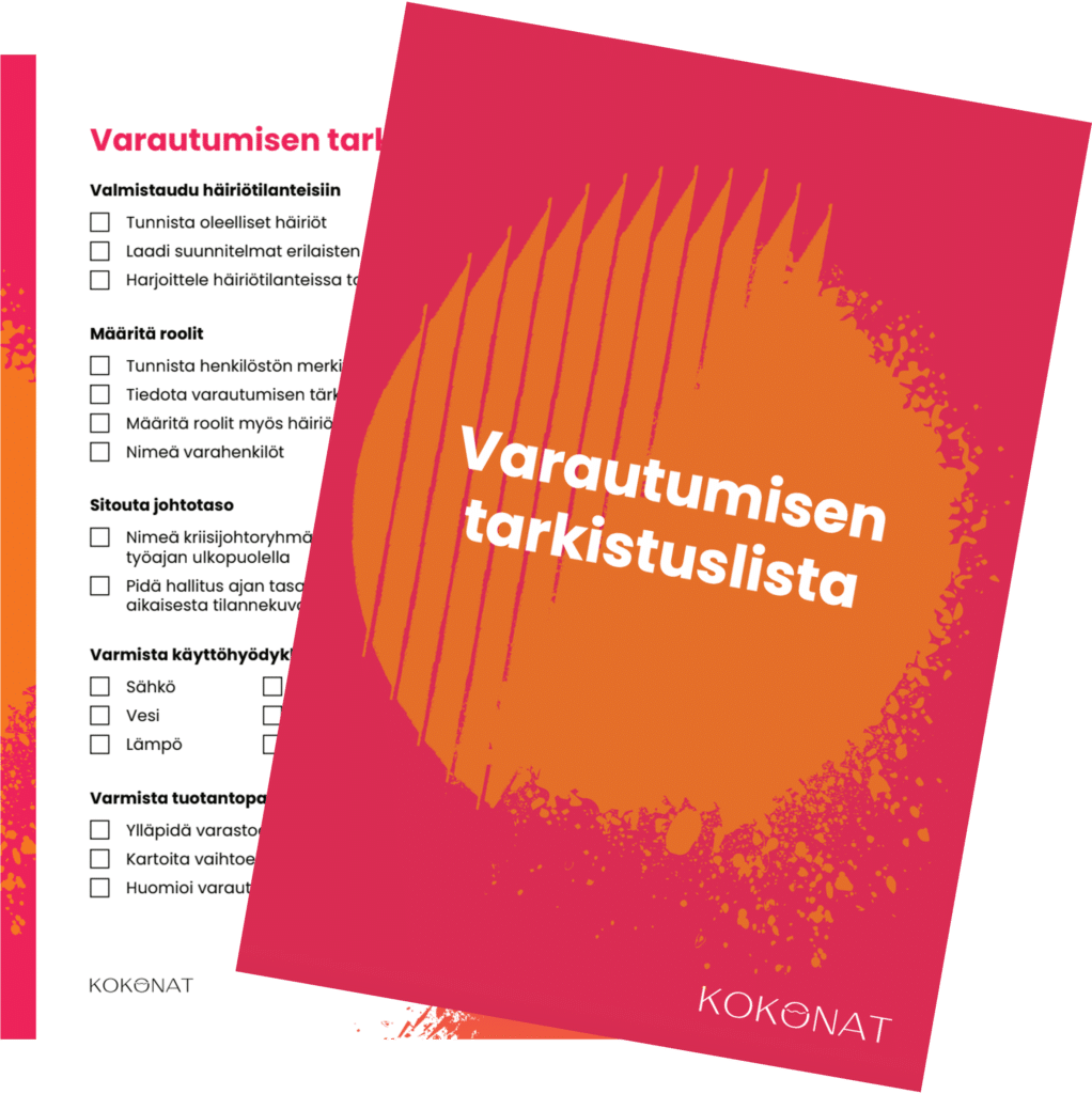 Varautumisen tarkastuslista on apuväline, jolla voi arvioida oman organisaation varautumisen nykytilaa ja tunnistaa toimia, joilla sitä voisi kohentaa. Sen ensimmäisellä sivulla käsitellään toiminnan edellytysten turvaamiseen liittyviä asioita ja toisella sivulla enemmän viestintää ja tilannekuvan ylläpitoa. Yksi keskeinen nosto listalta on se, että varautuminen on sitoutumista henkilökuntaan.